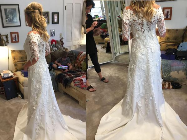 the risk. The bride requested an off-the-shoulder look for the ceremony at the Catholic Church (St. Patrick's in NYC no less), and then she would remove the jacket for the reception.