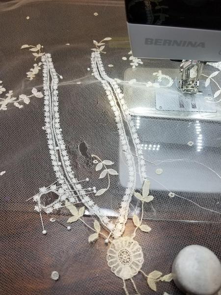 But not to fear, because I did repair the veil, but I had to add some lace to some areas that you can't see unless you have an extremely sharp eye. I had to do a wavy stem down the middle of the veil, and in that, I was able to hide the repair of the center