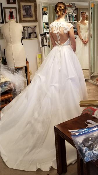 and Saturday evening, and Sunday morning on the way to the airport. I finally talked her into another trip back home so that I could have one final fitting, and she could see the gown very much finished.