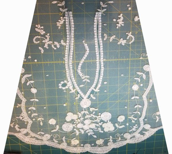 way the family could have hand something so gorgeously done today as the cost would be prohibitive. The original wedding for this gown was in the winter, so the lace had white velvet insets, which made the lace even more special. I was table to take the lace from the sleeve and some medallions from the skirt to fill in around the neckline and boom - we had a gorgeous gown!