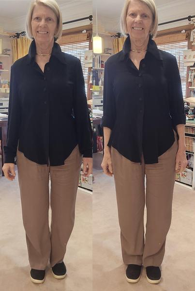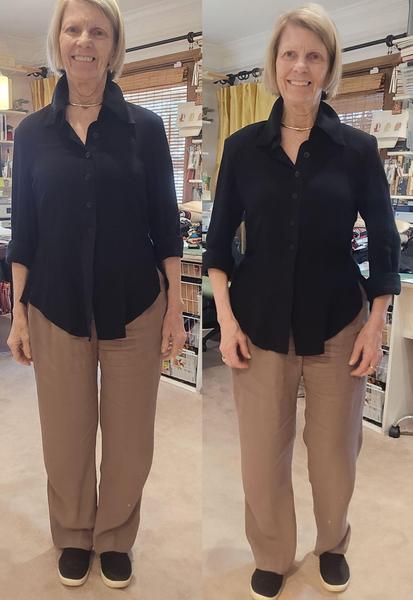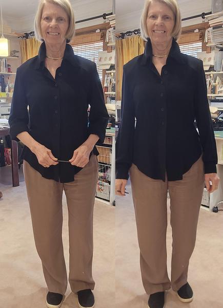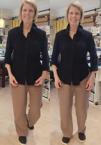me that you can lose 10lbs. with a set of shoulder pads. The reason is that it throws the proportion correctly, balancing the shoulders and hips. What I'm probably going to do is order a stack of 1/2" pads from Wawak, as these are 3/8" pads. That way, I can use one 3/8" for the left side and the other 1/2" for the right side. Notice how the blouse hangs so much better on the right? Notice the shape definition under the arm? Notice how the blouse hangs better from the waist onto the hips without riding up or needing more space at the hips? And most importantly, notice how everything looks